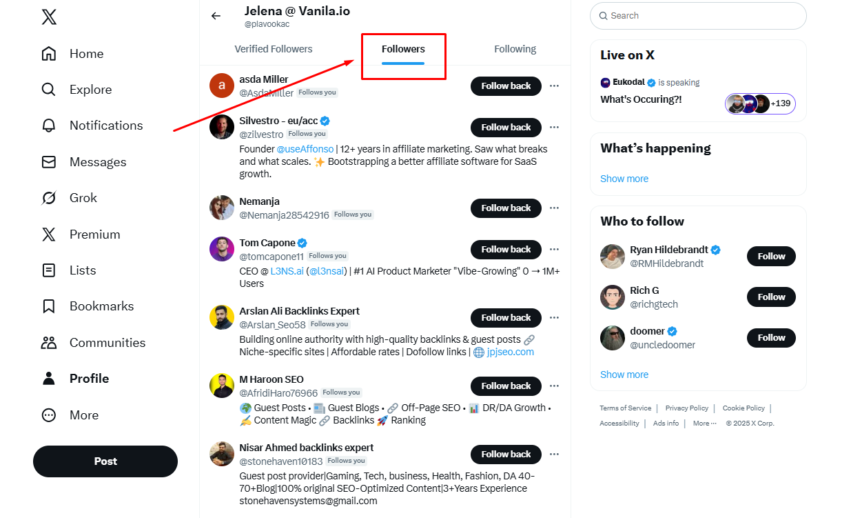 - Open X on web and go to your profile: Log in to X (Twitter) on a web browser. Navigate to your profile page and click on your followers count to view the list of who follows you.