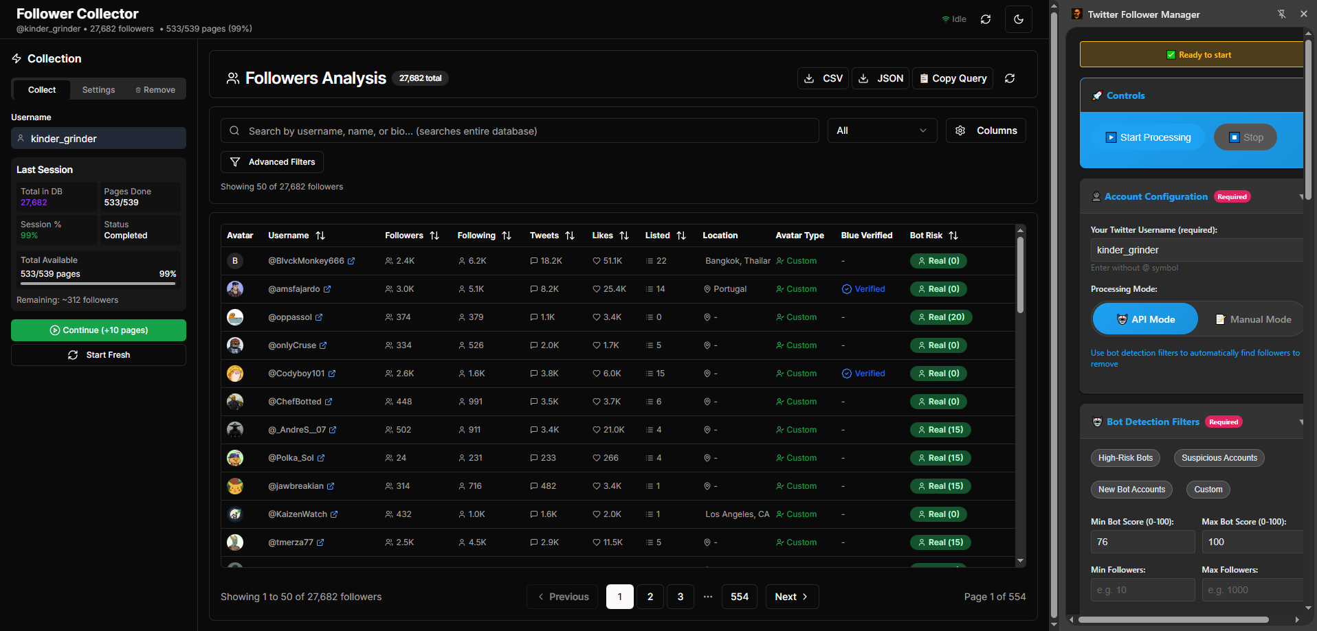 Open the extension panel. Choose API Mode or Manual Mode, and set your cleanup preferences — for example, remove users with a high bot score or very low follower count. Use built-in categories like High-Risk Bots, Suspicious Accounts, or New Bot Accounts, or apply your Custom Filter for full control. - Start processing.